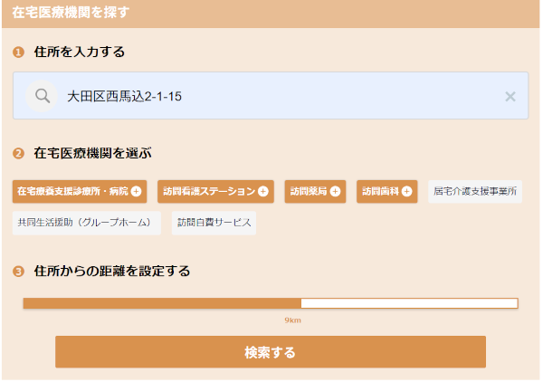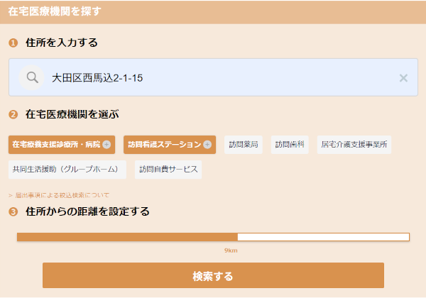 検索画面にて在宅医療機関種別を選択し、ボタンの右端の