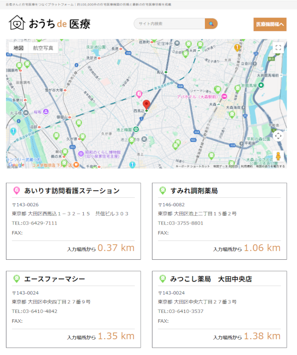 検索結果がGoogleMAP上および結果リストに表示されます。