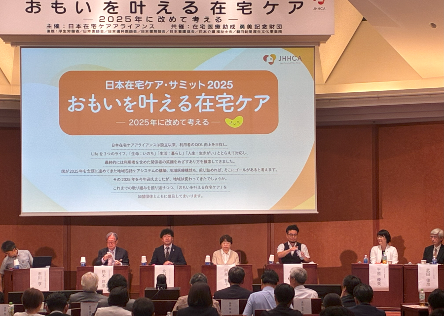 日本在宅ケアアライアンスの事業成果の共有を通じ、会員間の連携強化、情報交換、交流を図るとともに、在宅ケア推進のための更なる取り組みを考えていく「日本在宅ケア・サミット2025」が開催されました。「おもいを叶える在宅ケアー2025年に改めて考えるー」と題して、基調講演では、元厚労省局長・未来研究所臥龍代表理事の香取照幸氏が「2040年に向けて、在宅ケアの可能性を考える」をテーマに登壇し、2040年を見通して、今行う、意識改革・行動変容の重要性について語りました。また、5名によるシンポジウムでは、「おもいを叶える住まいと在宅ケア」をテーマにホスピス住宅や在宅医療・介護の現状と課題について議論され、参加者にとって大きな学びの場となりました。