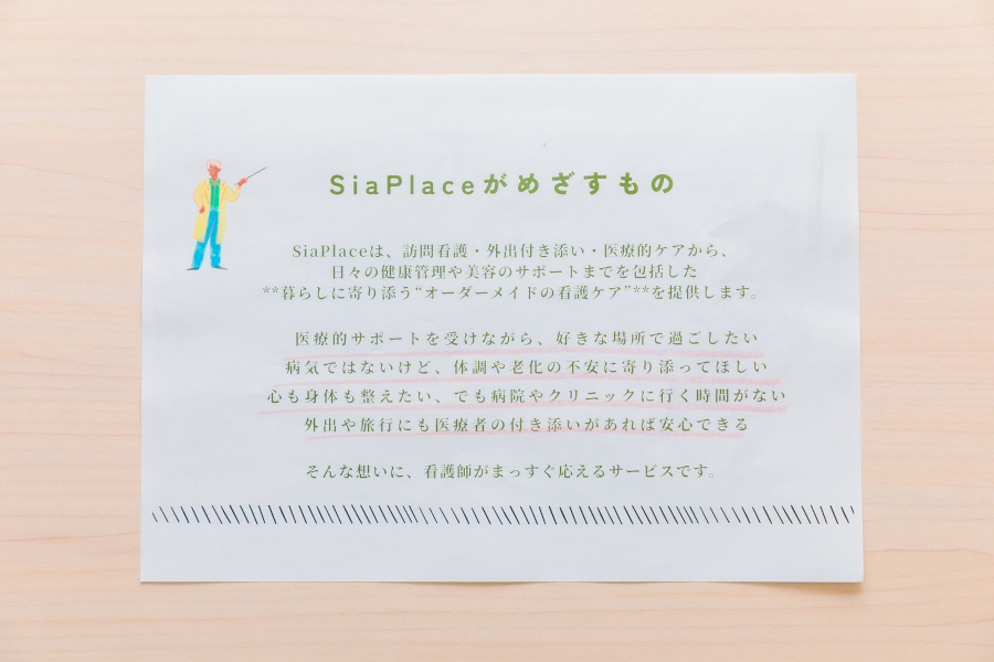 SiaPlaceでは、在宅医療に取り組む方が必要とする支援を、それぞれの状況に合わせて提供し、安心できる存在でありたいと考えています。