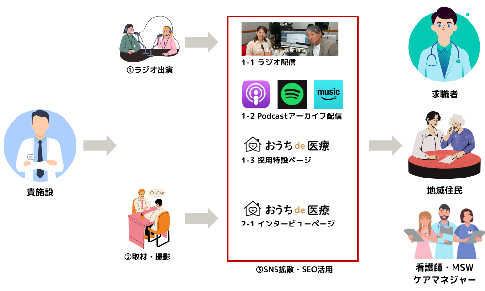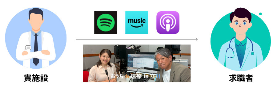 「Voice Recruit(ボイス・リクルート)」は、ラジオ出演とPodcast配信を活用した、在宅医療クリニック・訪問看護ステーション向けの採用広報サービスです。