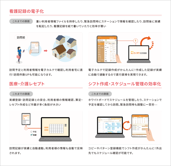 カイポケ訪問看護を利用することで、直行直帰の実現やリモートワーク環境での職員間の情報連携を強化、業務の見える化などを促進し、業務効率化と本来の訪問看護業務に集中できる事業所運営に貢献していきたいと考えております。