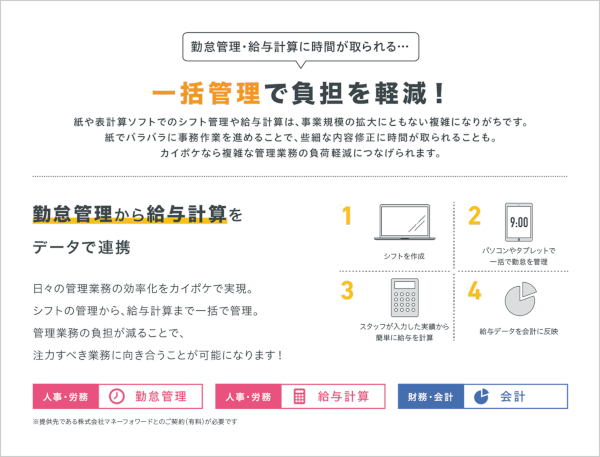 3. マネーフォワードと連携した給与計算や利用者請求の口座振替など経営支援サービスもご用意