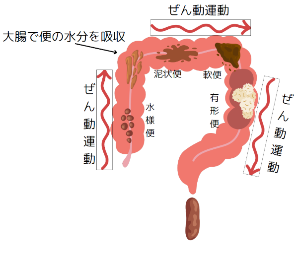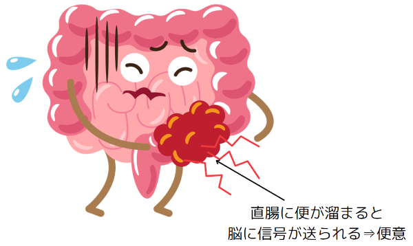 排便のメカニズムは、大腸内を進んだ便が直腸に到達し、そこが膨らむことで便意を感じるという流れです。